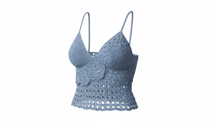 Brassière crochet femme faite main, coloris bleu ardoise, mailles dentelle ajourées et finitions scallop inspirées de Byblos. Une pièce artisanale unique de la collection Éclat de Beirut — légère, élégante, inimitable.