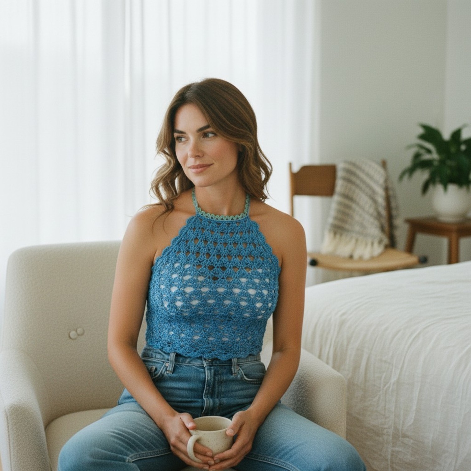 Ce crop top crochet dos nu se porte avec une spontanéité étudiée. En journée, associez-le à un jean taille haute bleu moyen ou blanc cassé — l'effet décontracté chic est immédiat. Pour la plage ou un festival, portez-le sur un bikini haut coordonné ou une bralette nude en dessous. En soirée estivale, optez pour un pantalon palazzo en lin écru et des sandales à talons sculptés pour un look méditerranéen raffiné. Le dos nu du crop top crochet halter neck se suffit à lui-même comme élément de style — un simple chignon bas suffit à le mettre en valeur.