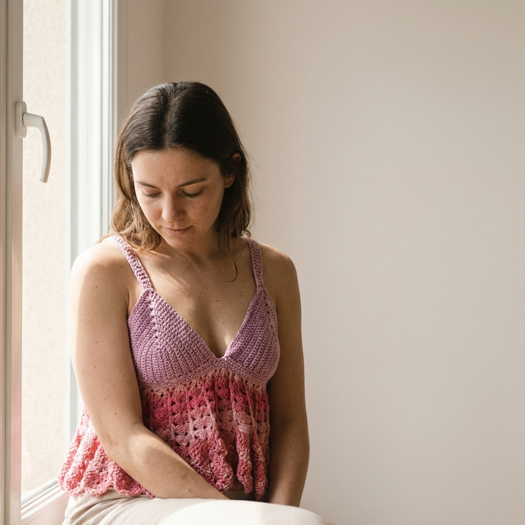 Ce processus fait main implique des heures de travail minutieux pour chaque haut. La coupe baby-doll légèrement évasée, l'encolure en V élégante, les bretelles fines ajustables, le motif ajouré floral sur la jupe — chacun de ces éléments est pensé, travaillé et fini à la main. L'ourlet festonné en coquilles, qui borde le bas du haut comme une vague, est la signature artisanale de FeniCrochet : un détail que l'industrie ne peut pas reproduire à l'identique.