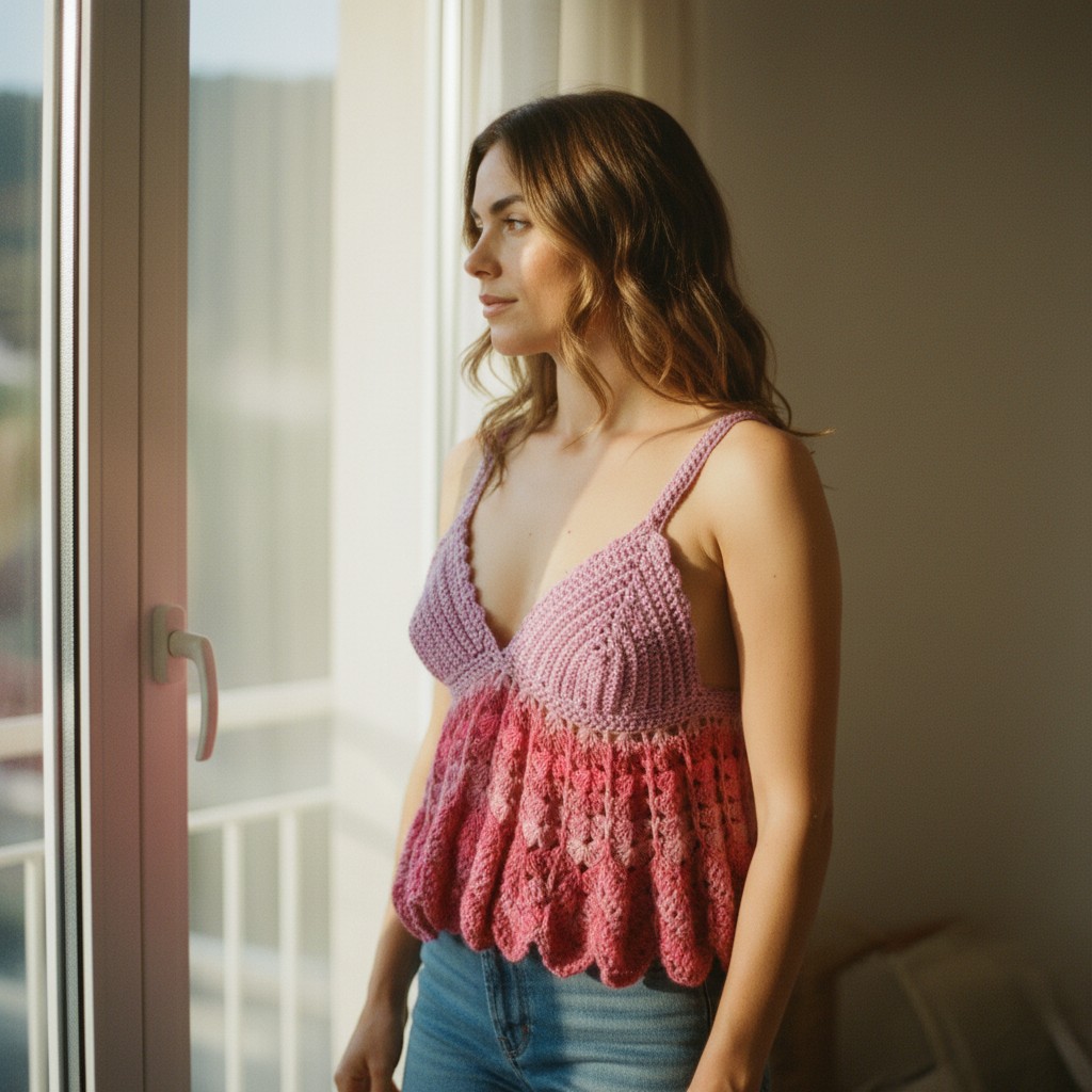 Un haut crochet femme rose 100 % fait main, aux teintes dégradées du parme au fuchsia. Coupe baby-doll évasée, encolure V et ourlet festonné en coquilles — la signature du crochet artisanal FeniCrochet. Pièce unique, stock limité. Sur-mesure disponible.