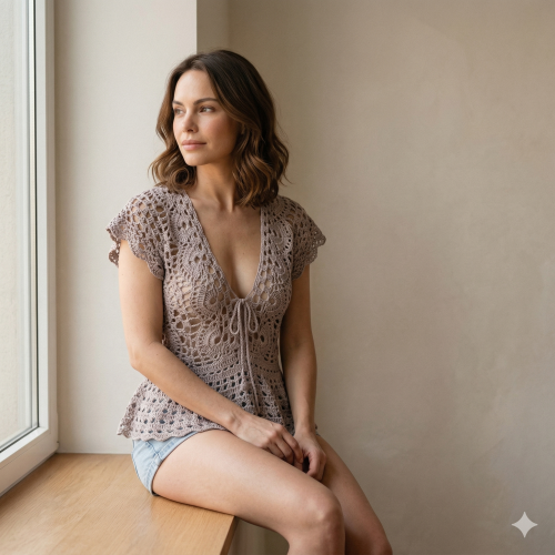 Ce top crochet bohème femme se distingue par son décolleté en V noué, ajustable selon vos envies, pour un style chic et romantique. Ses manches volantées apportent une touche de légèreté et d'élégance, tandis que ses motifs ajourés au crochet — travaillés à la main avec minutie — habillent le corps avec délicatesse.